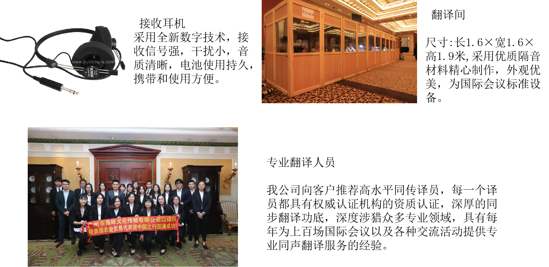 Star-Meeting會(huì)議服務(wù)公司對(duì)于這一領(lǐng)域的嚴(yán)格要求,已經(jīng)遠(yuǎn)遠(yuǎn)超越了對(duì)橫向其它服務(wù)內(nèi)容的關(guān)注。作為專業(yè)的公關(guān)會(huì)議活動(dòng)服務(wù)機(jī)構(gòu),Star-Meeting會(huì)議服務(wù)公司所用的同聲傳譯設(shè)備全部為德國博世公司所生產(chǎn)的產(chǎn)品,質(zhì)量可靠,聲音清晰,沒有任何雜音,且采取無線接收。同時(shí),在翻譯人員方面,也可以滿足英語、日語、法語、德語、俄語等各語種的外語翻譯并覆蓋幾十種專業(yè)領(lǐng)域。高水平的同傳譯員,高質(zhì)量的同傳設(shè)備,再加上音響、視頻等設(shè)備,共同成為我們高質(zhì)量服務(wù)的基礎(chǔ)保障。