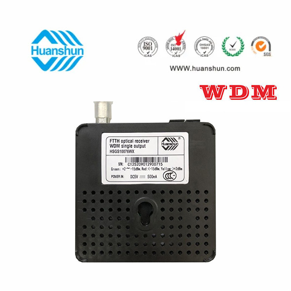 WDM型單輸出FTTH光接收機(jī) | HSGS10076WX | CATV 1540~1565nm接收,-5~-15dBm/RF 76dBuv恒定輸出,PON:1270/1310/1490/1577nm;外置90~255V 5V 0.5A電源適配器 |