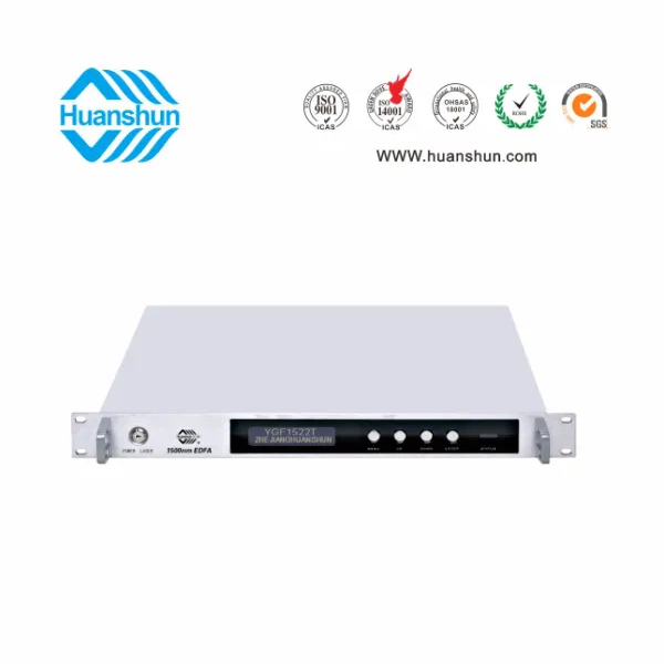 YGF1522T | -3 ~ +10 d Bm輸入,標稱規格(22、23、24)功率放大輸出,并支持上調+0.5dB,下調-3dB,NF ≤ 5dB(0dBm時);1U標準機箱,雙模塊熱插撥電源,AC90 ~ 255V或DC-48V供電,RJ45標準網管(支持SNMP、WEB) | |