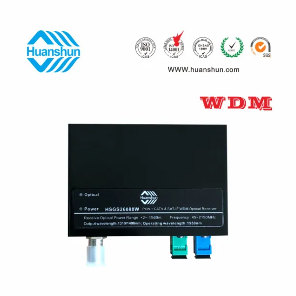 HSGS26082系列CATV&SAT-IF光接收機(jī)是一款FTTH型CATV+SAT IF高性能光傳輸設(shè)備,適用于有線電視和衛(wèi)星直播電視同網(wǎng)傳輸。本機(jī)選用高帶寬、高靈敏度光電管和低噪聲匹配電路,全鉮化鎵IC放大,光接收范圍-15~+2dBm,光控AGC-8~0dBm/RF80dBuv恒定輸出。為方便用戶使用,本機(jī)還在面板上設(shè)有工作電源和光功率接收監(jiān)測(cè)LED指示燈。HSGS2608W為WDM型CATV&SAT-IF光接收機(jī),它工作于CATV1550nm段和PON段1490/1310nm段,用WDM波分復(fù)用技術(shù)分離出1540~1565nm波長(zhǎng)作CATV光信號(hào)接收,把PON段1490/1310nm分離到PON端口,以作PON下聯(lián)到E/GPON ONU。